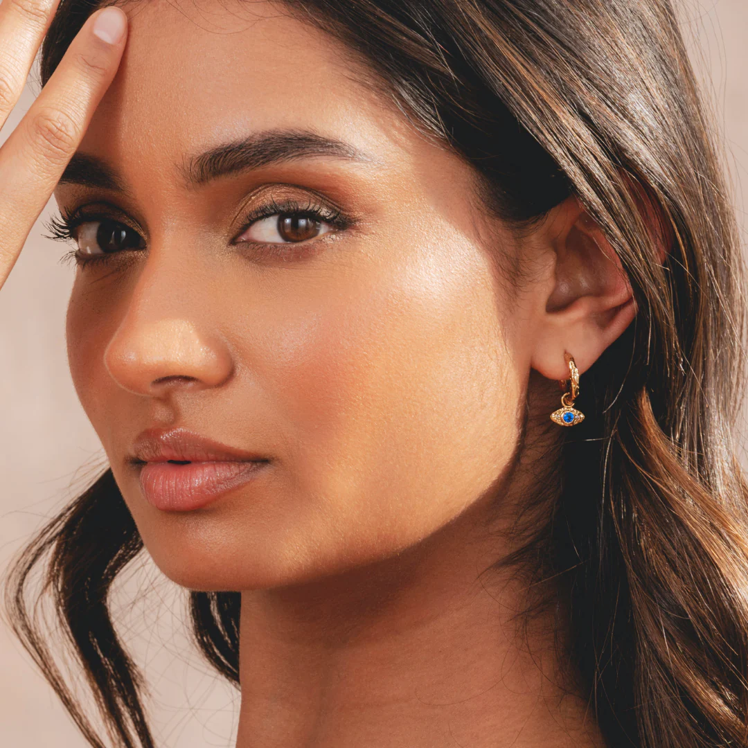 Featuring vibrant blue cubic zirconia and a molten, organic hoop design, they’re equal parts striking and meaningful. The symbolic evil eye charm is known for shielding against negativity, making these earrings more than just a style statement.