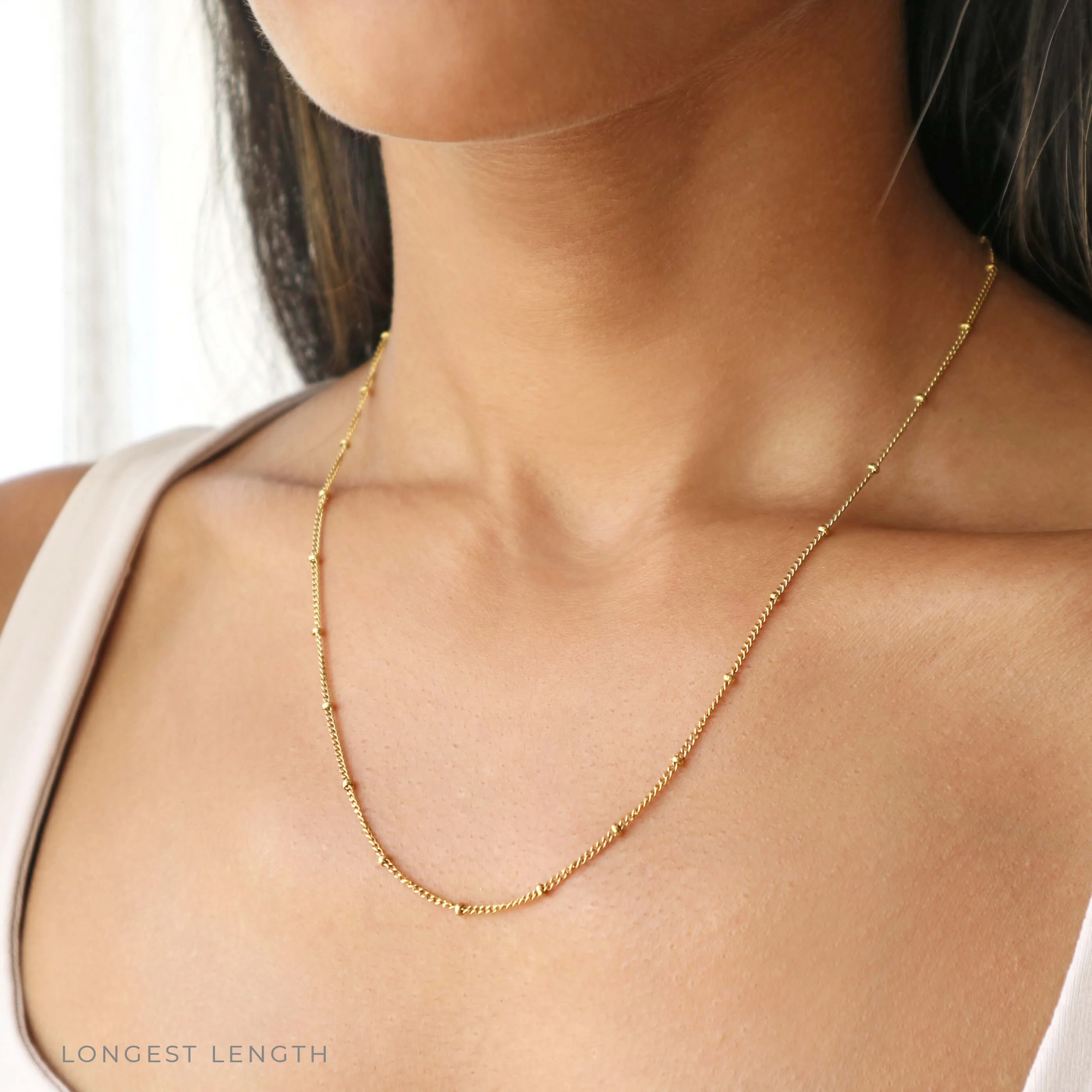 Elevate your everyday style with our delicate gold Satellite Chain Necklace. Crafted for versatility, its shorter length is ideal for layering, allowing you to create endless combinations. With its water-resistant feature, you can enjoy durability & beauty without compromise.